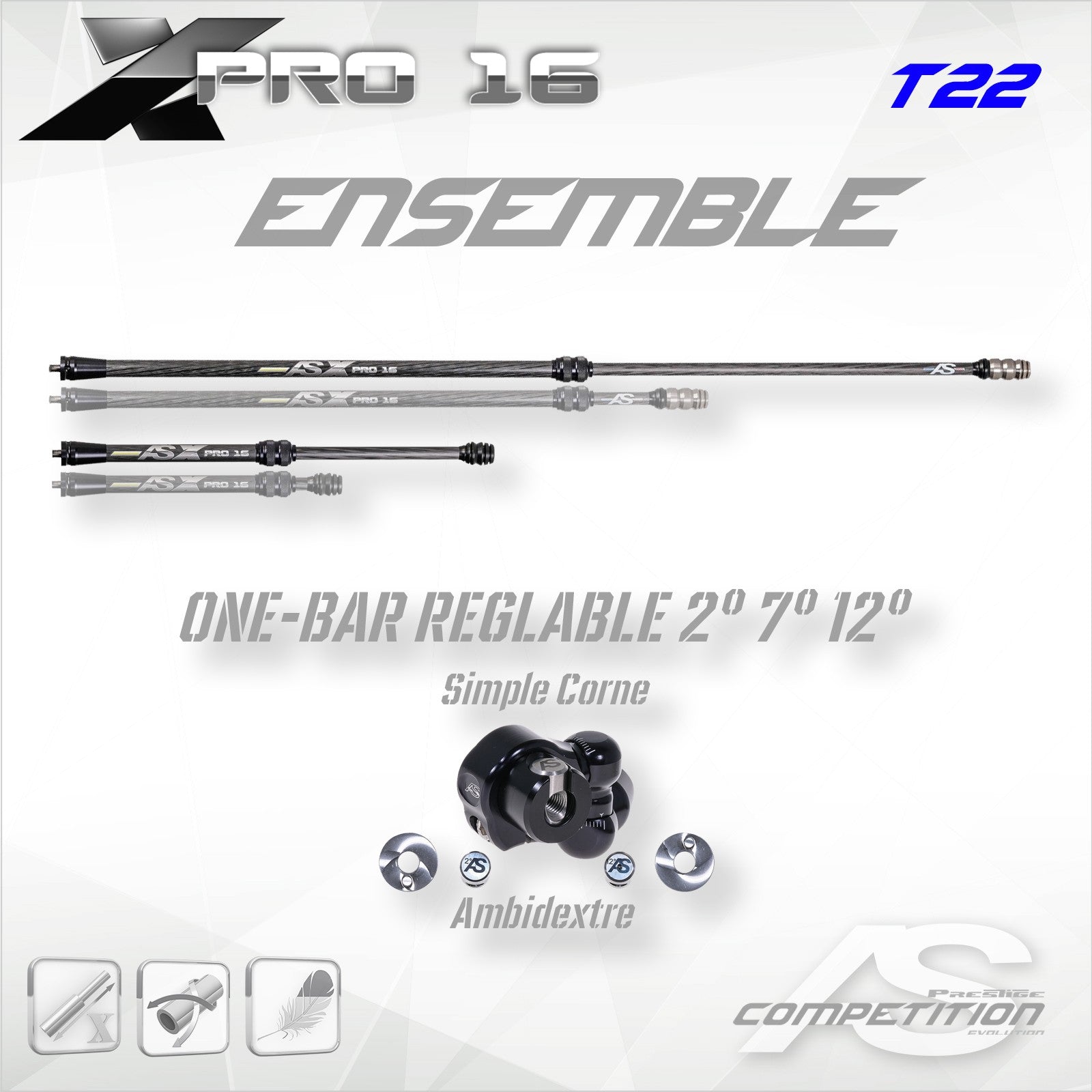 Telescopic kit 16mm with VBAR TRIO (do not mount on carbon directly). Weights fixing tulip included (T12/22 or T12/35). T22 comes with 2 intermediate weights and 1 finishing weight (22mm and 30g each). T35 tulip alone. Telescopic dimensions from 52.5 to 80cm (21 to 31.5in). Telescopic dimensions from 22.5 to 35cm (9 to 14in). Graduations per inch (25mm). Tightening wrench supplied.