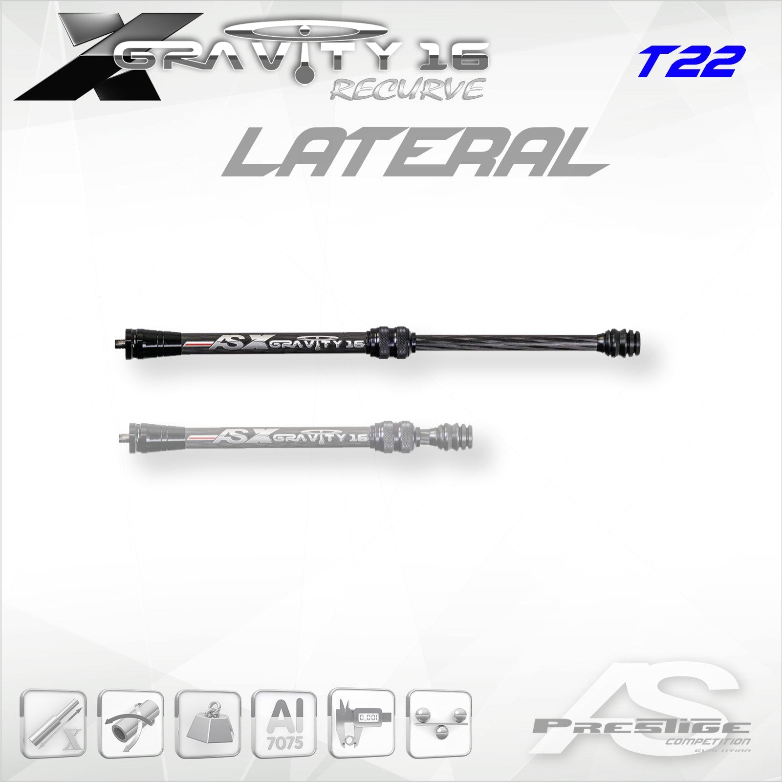 Telescopic side bar 16mm alone (RECURVE cover comes with CENTRAL and KIT). The AS line is designed for the best compatibility between all accessories. Aluminium 7075. Varnished finish. Weights fixing tulip included (T12/22 or T12/35). No weights included. Telescopic dimensions from 22.5 to 35 cm (9 to 14in). Graduations per inch (25mm). Tightening wrench supplied.