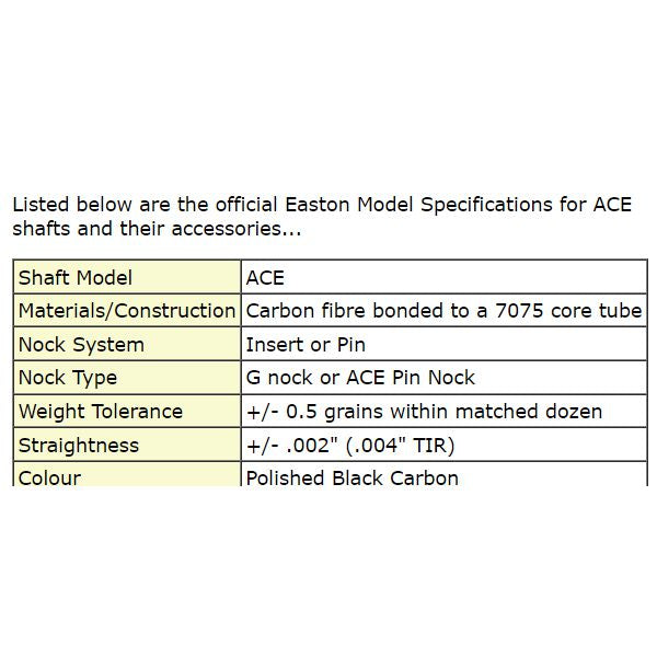Easton ACE shafts should be sold only in matched dozens - as supplied by Easton. Beware of any dealer selling part sets or individual shafts.