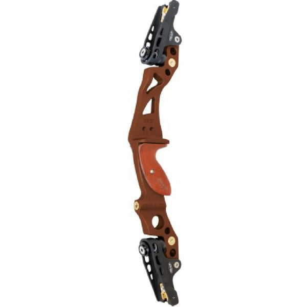 Formula limb fitting model - The GT riser series has expanded to cover the range of Hunting risers from Gillo. The old G5 Ghost model has been replaced by the GT 23in, 21in Formula and the GT 21in, 19in ILF models. The unique GT floating limb pockets allow over 30% poundage adjustment range without any compromise to the stability of the limbs. The GT 21in Hunting risers are available in RH and LH models in Black/Brown and Black/Grey matte anodized colour options and are supplied with the attractive root colour wood grips as standard.