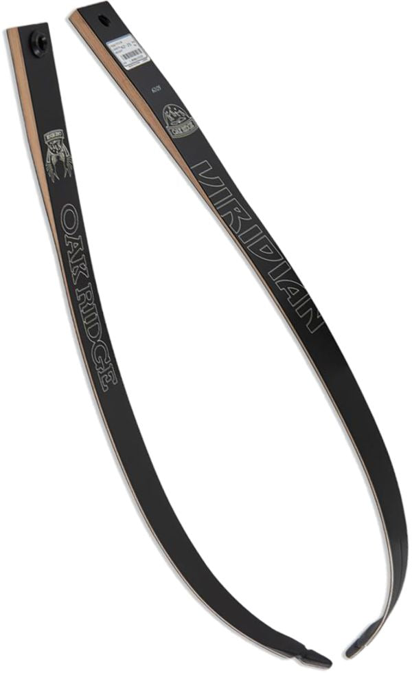 Entry level limbs suitable for hunting take-down recurve bows with screw-type limb fitting. Oak Ridge Viridian limbs are constructed from Maple wood and black glass. Available in 62in length only poundages ranging from 25lbs to 55lbs rated with a 19H riser....