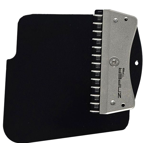 Another unique adjustment feature of the ZNIPER tab EVO is the ability to freely set the grip marks. This means that the grip marks can be set individually for any desired distance in 1 mm increments, making incorrect gripping a thing of the past, especially when shooting field-archedry or 3D-archery. The ZNIPER tab EVO comes with 13 grip markers as standard, and additional grip markers are included with the tab. Using a plier, these grip markers can be moved and new markers can be added. The length of the base body of the ZNIPER tab EVO has also been extended by another centimeter, so that even very deep grips, e.g. for 5m, are no longer a problem. Please bear in mind, however, that for the 18m indoors, for example, it is not permitted to set just one grip marker for the 18m. In order to comply with the rules of WorldArchery and the DSB, a pattern must be present and this always consists of several grip markers, which can, however, be freely mounted on the tab - as far as the distance is concerned; the distance between the makers does not always have to be the same and the grip markers can be freely set.